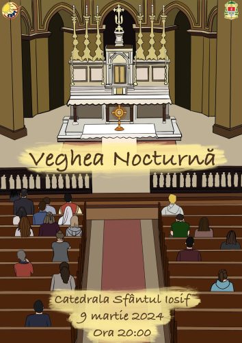 În noaptea dinspre 9 spre 10 martie 2024, în Catedrala Sfântul Iosif din București, 13 grupuri parohiale vor anima o veghe de rugăciune în fața Preasfântului Sacrament. Programul va debuta la ora 19:45, cu un moment introductiv de rugăciune oferit de către organizatorii din Centrul Diecezan pentru Pastorația Tineretului și va continua cu grupurile parohiale care s-au înscris la inițiativă, până la ora 6:45, următoarea zi.